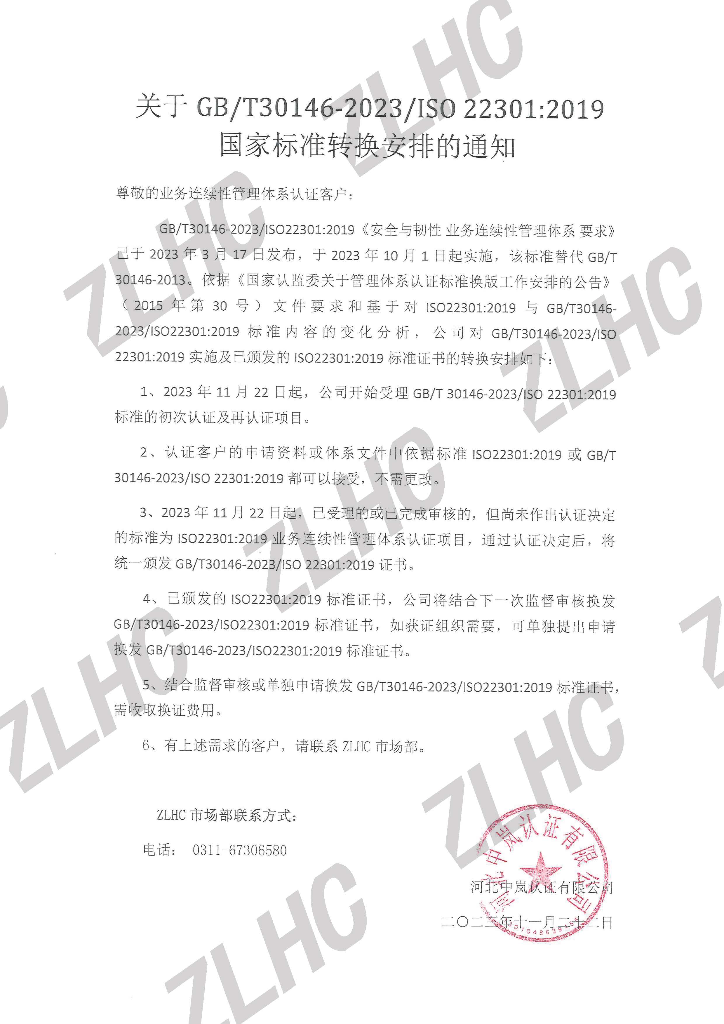 2023年11月22日 BCMS国家标准换版安排的通知